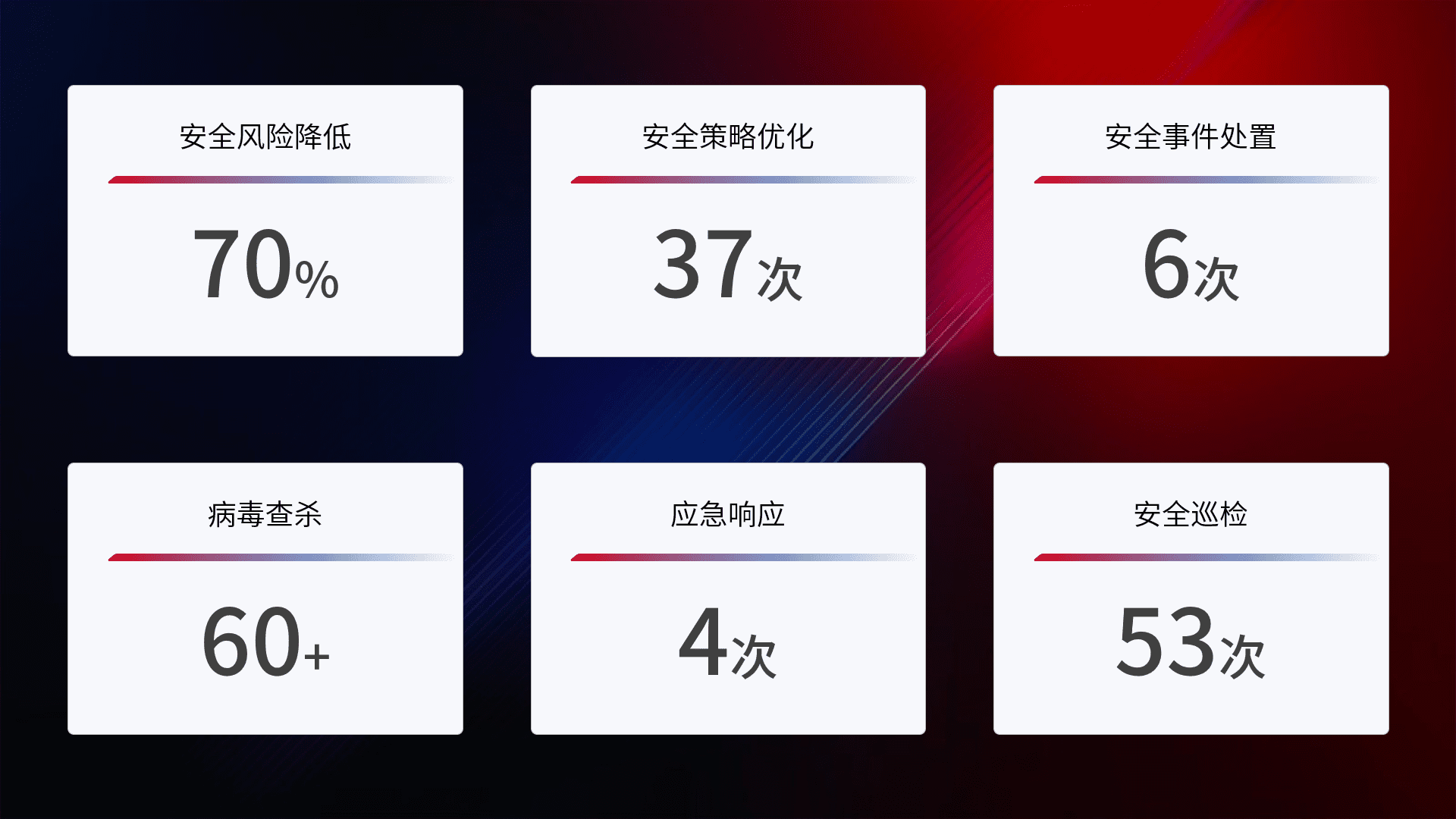 提供全面的安全事件报告体系,,,包括处置报告、、、周报、、季度和年度总结,,,,结合持续监控,,,帮助客户深入了解网络安全状况。。。